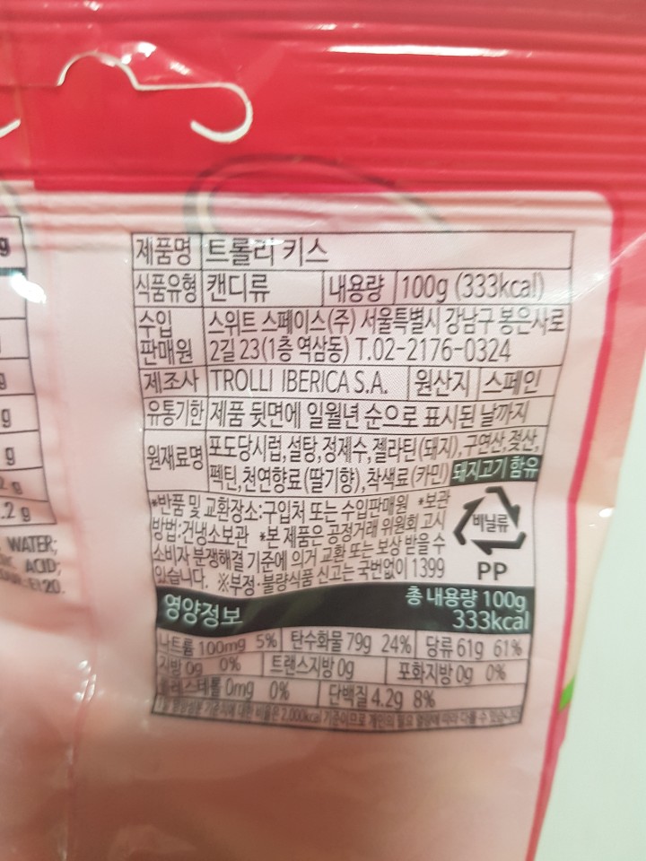 하리보 젤리 100g은 시중에서 1,500원에 구매를 할 수 있는 경우가 많은데 트롤리 젤리 100g은 보통 편의점이나 세계 과자 할인점에서 보시면 1,800원에 구매를 하실 수 있을 겁니다. 하리보보다 트롤리가 좀 더 단가가 비싼 것 같습니다. 분홍색과 빨간색이 주된 색으로 포장지가 꾸며져 있습니다. KISS라는 제품명이 뭔가 한번 더 보게 되고 끌리는 것 같습니다. 딸기 그림이 여러 개 그려져 있어서 누가 봐도 딸기맛인 것을 알 수가 있을 겁니다. 영양정보 및 성분 표시를 보도록 하겠습니다.