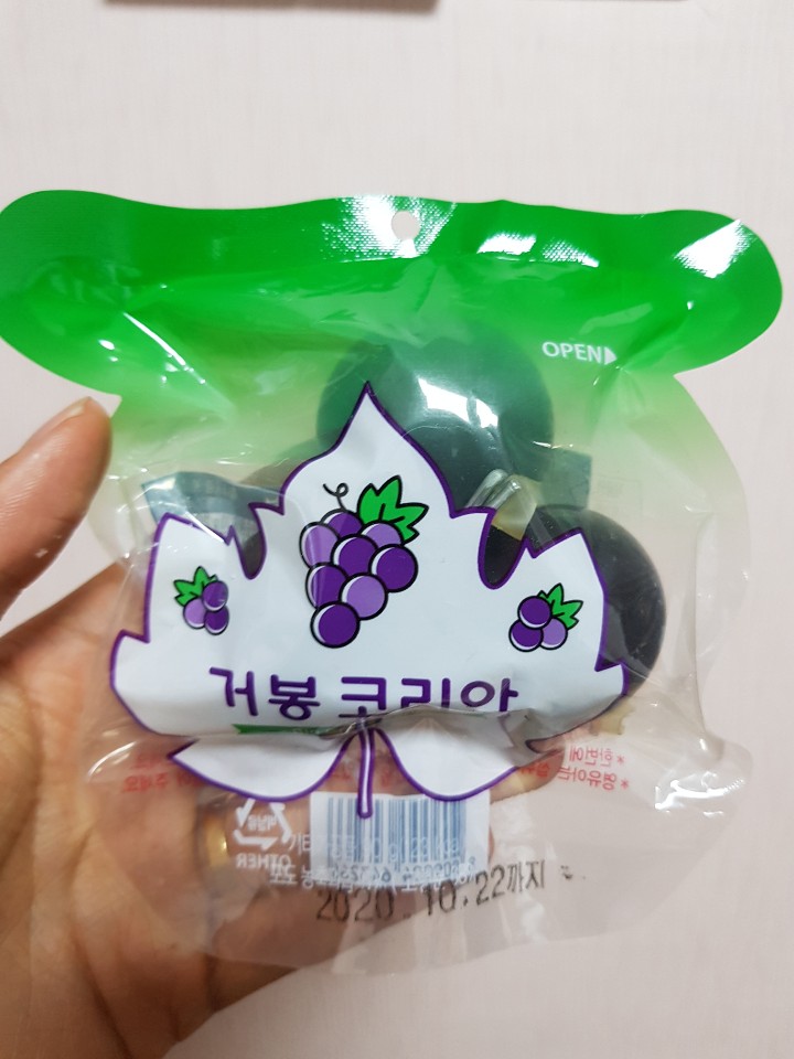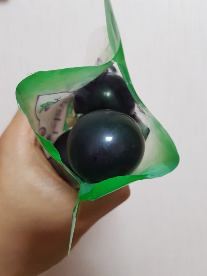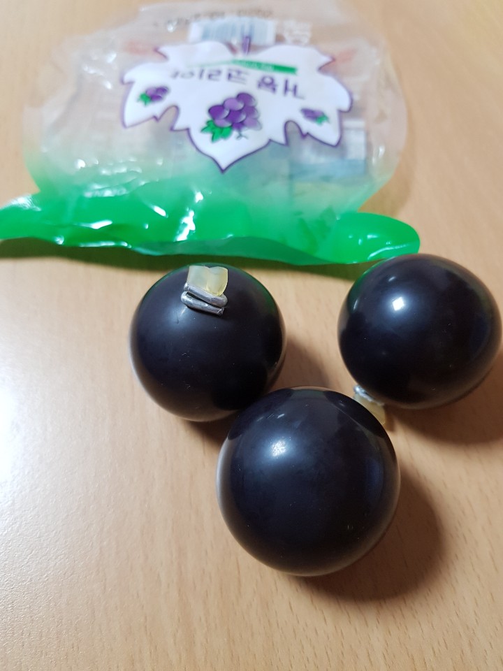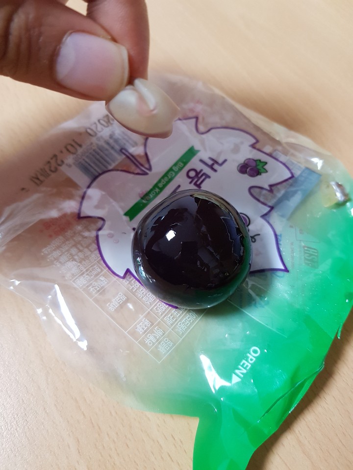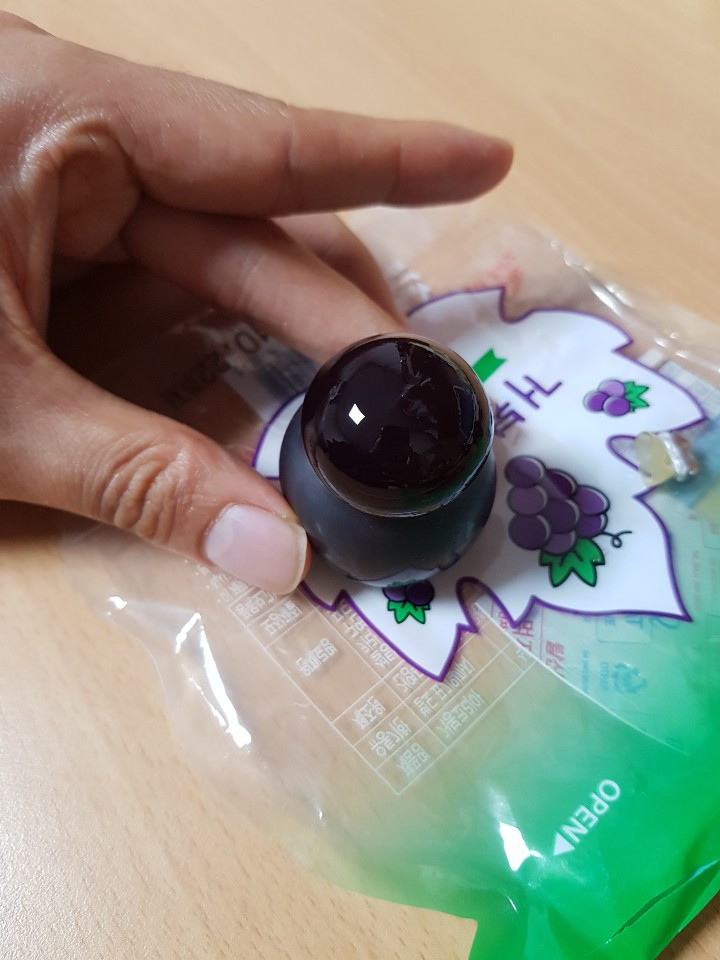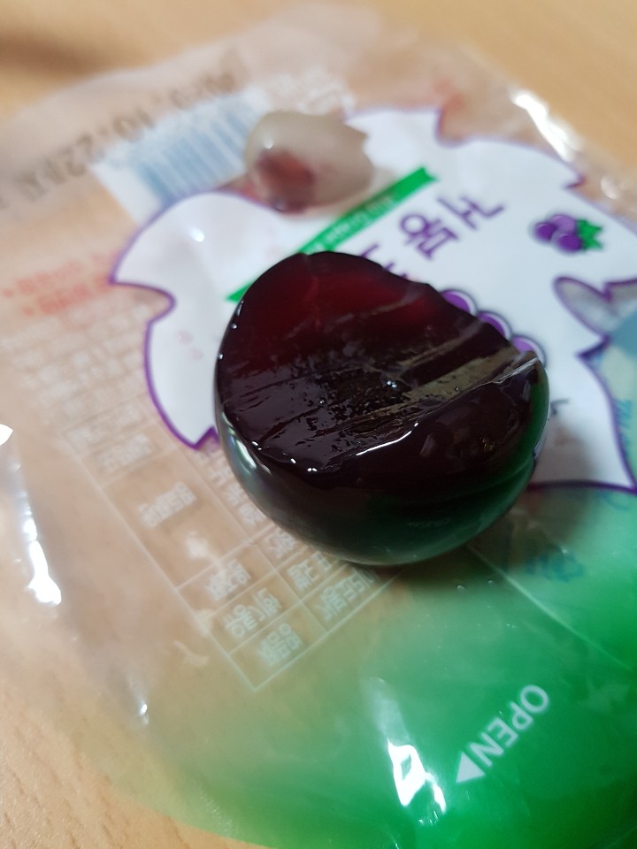 이빨로 반 정도를 베어물어 먹어보았습니다. 속안에 딱히 들어있는것은 없습니다. 달콤하고 아주 약간 새콤한 포도의 향기가 정말 맛있었습니다. 쫀득쫀득한 식감이 너무 좋았습니다. 제가 이전에 포스팅했던 유키앤러브젤리와 아주 비슷한데 유키앤러브 젤리가 좀 더 물이 많고 잘 부숴지는느낌의 차이를 제외하고는 비슷했습니다.