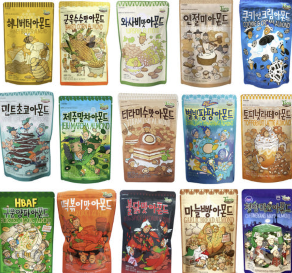 떡볶이맛아몬드, 와사비맛 아몬드, 인절미아몬드, 티라미수 맛 아몬드 최근에는 별빛팡팡 아몬드까지!