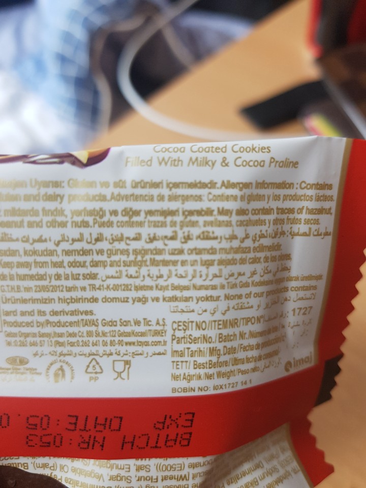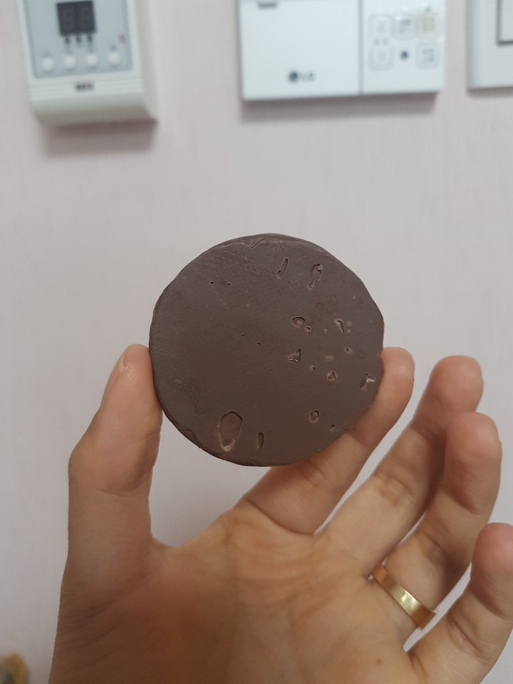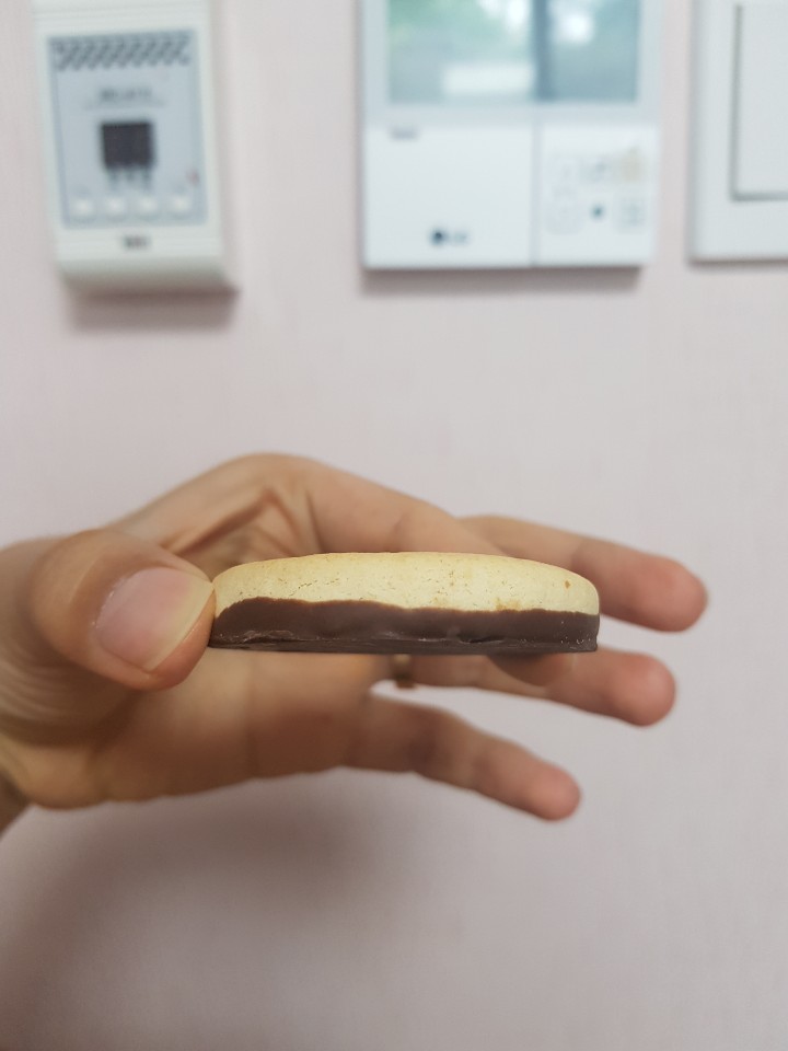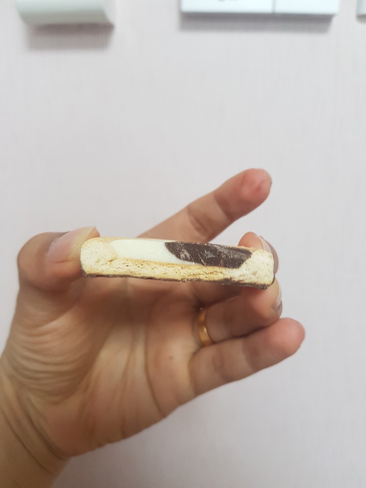 약간 눅눅한 과자 속에 초콜릿 필링이 채워져 있는 형태예요.